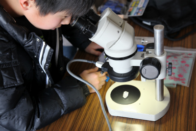 ![]() 双眼立体顕微鏡で見ています。この後デジカメで撮影します |