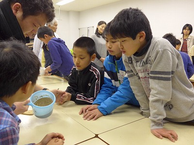 ![]() あれれ、水が出てきたよ 地震の時の液状化の実験です |