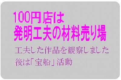 100円均一店は、発明工夫の材料売り場です。 100均店の材料で作った、先生の工夫品を見ました。 そのあとは、宝船。 |