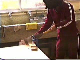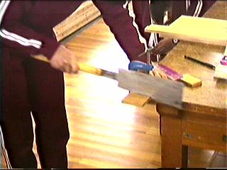 し,のこびき方法の改善に集中させる。(ゴムが付いているものか端材をはさんで板に傷が入らないように・・)