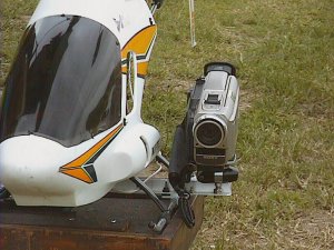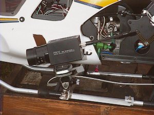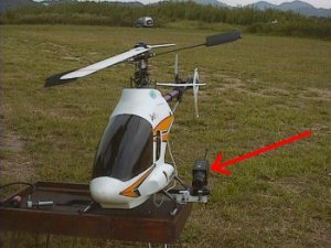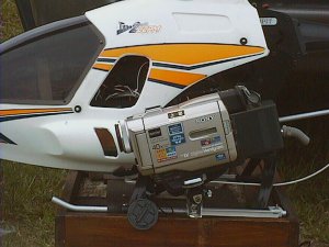 1999.9.6 今日はハンディーカムをヘリに積んでみました。左が重いのでエルロンのトリムが半分くらいずれましたが,案外簡単にできました。
